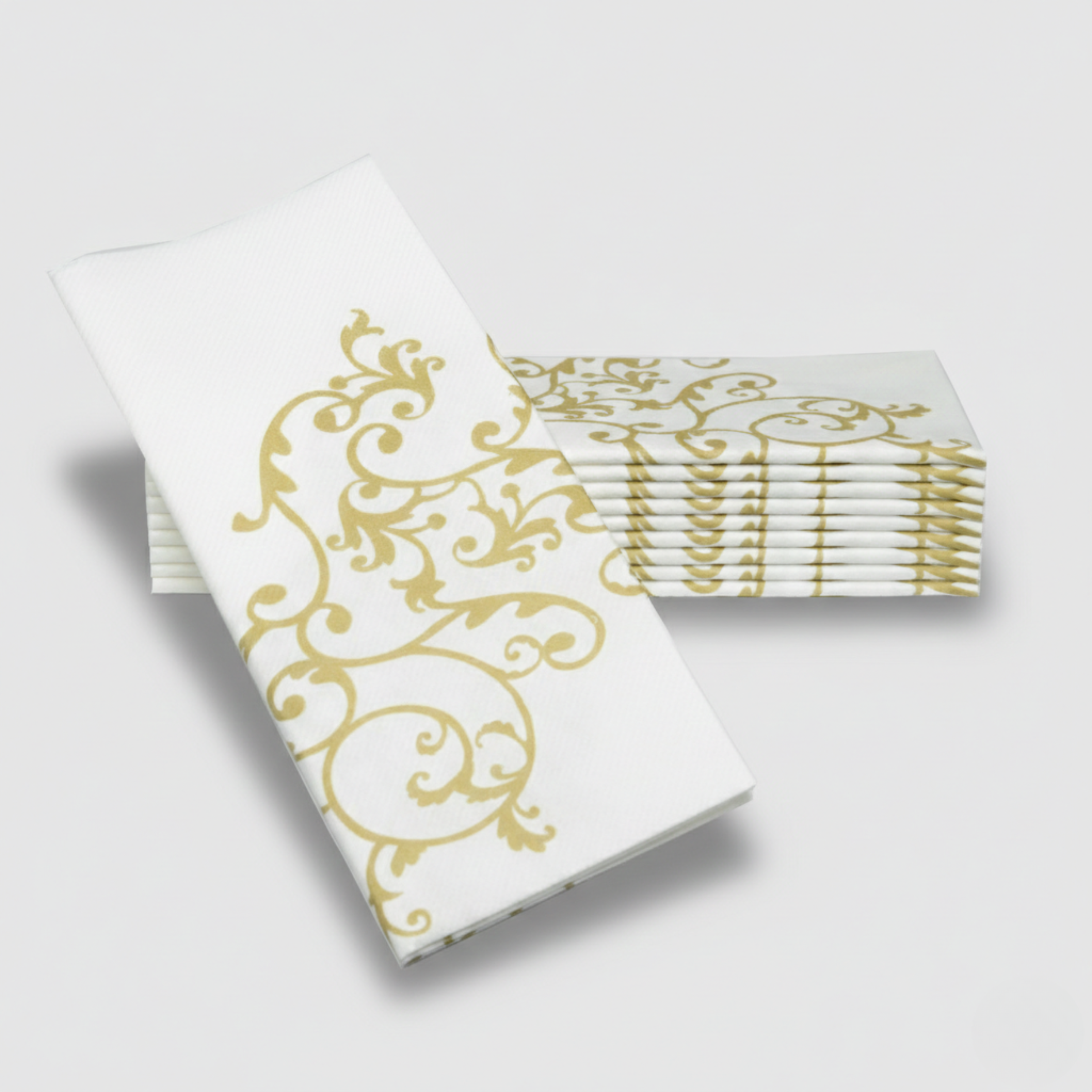 Introducing our 19"x17" luxury paper dinner napkins, meticulously designed to simulate the texture of real linen while offering the convenience of disposability. Engineered with cutting-edge technology that fuses premium cotton and paper, these high-quality paper napkins deliver a sophisticated blend of elegance and durability. With their beautiful appearance straight out of the packaging, our luxury dinner napkins are the perfect choice for baby showers, weddings, parties, and everyday use at home. Enhanced with Special Airlaid technology, they boast superior thickness and absorbency, ensuring a luxurious dining experience every time. Adorned with an elegant gold floral design, these disposable napkins effortlessly enhance the ambiance of any table setting, making them a must-have for those who demand nothing but the best.